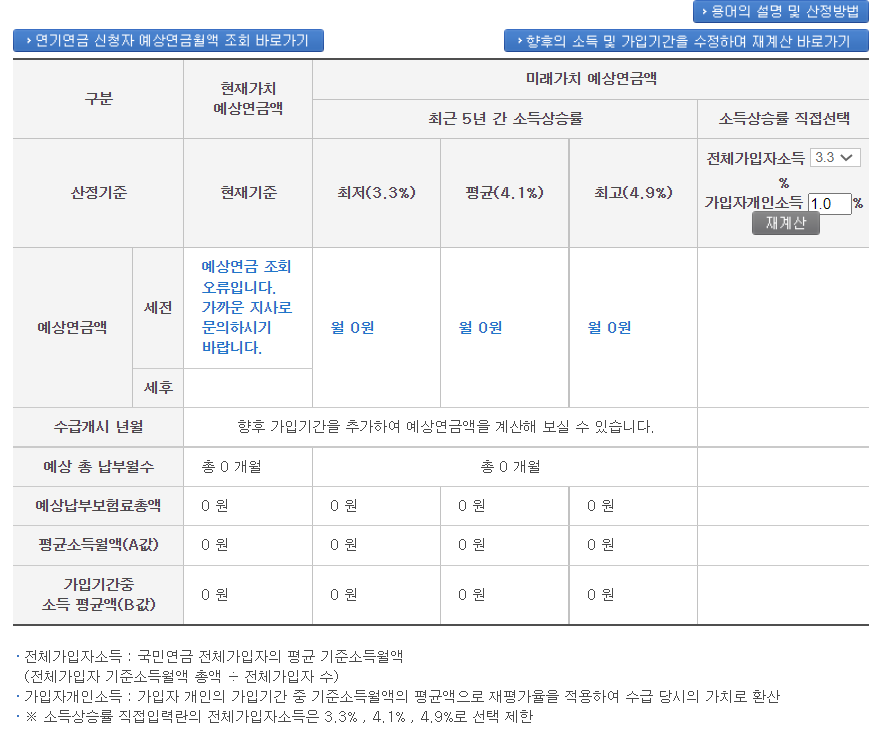 저는 국민연금에 아직 가입되지 않아 아무런 정보가 없지만 가입 후 납입내역이 있는 분들은 국민연금 예상수령액 조회가 가능합니다.