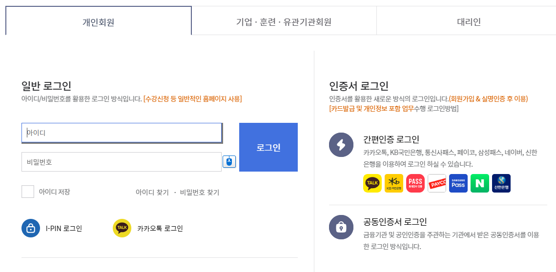 회원가입을 먼저 진행해야하는데 개인회원, 훈련기관회원, 기업회원중 개인회원을 선택합니다.