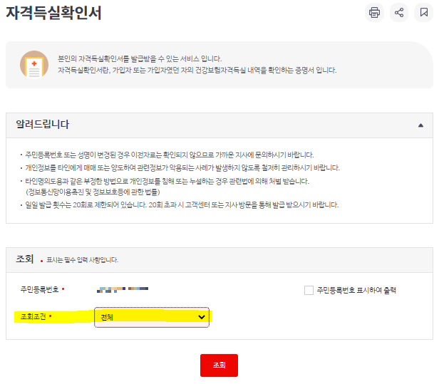 본인인증 후 건강보험자격득실확인서 발급에 있어 [전체], [직장가입자], [지역가입자], [가입자전체] 중 조회조건을 선택을 하셔야합니다.