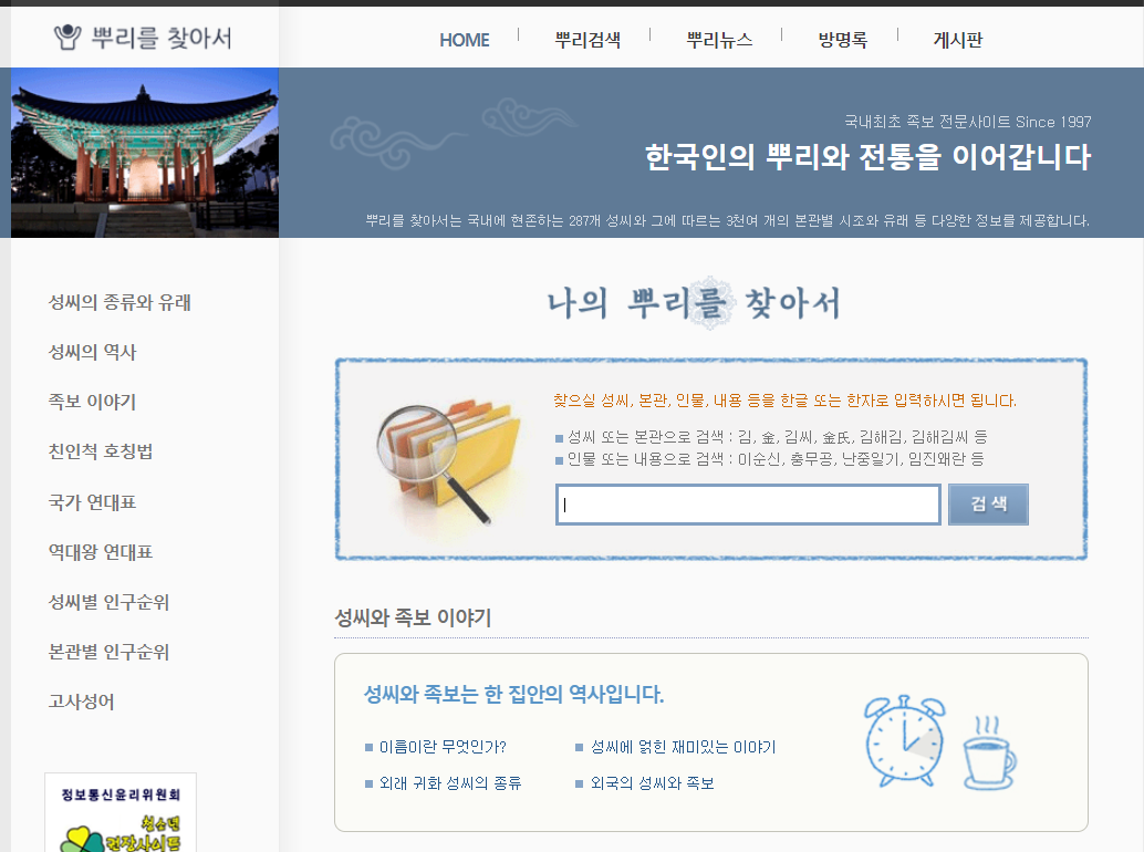 만약 본인 성씨에 대해 좀 더 자세히 알고 싶으신 분들은 뿌리를 찾아서 홈페이지를 통해 확인하실 수 있습니다.
