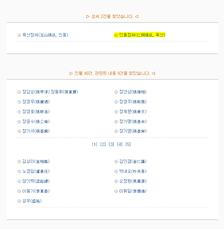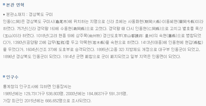 저는 인동장씨를 검색해보았습니다. 검색결과는 다음과 같습니다.