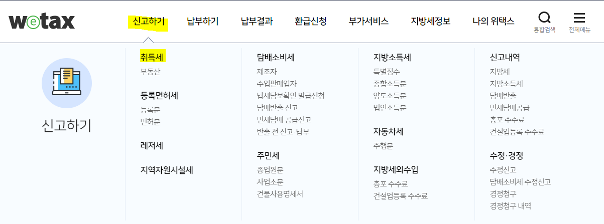 별도의 로그인이나 인증서 없이 진행 가능하며 [신고하기]->[취득세]->[취득세 모의계산] 순으로 클릭합니다.