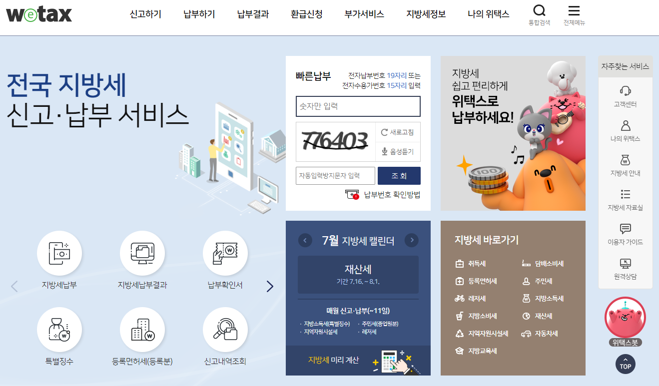 위택스 메인화면으로 돌아와 [납부하기] -> [지방세]를 클릭합니다.
