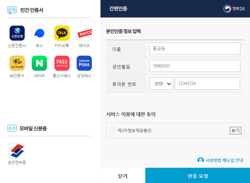 간편인증의 경우 통신사, 카카오, 네이버 등을 지원하고 있습니다.