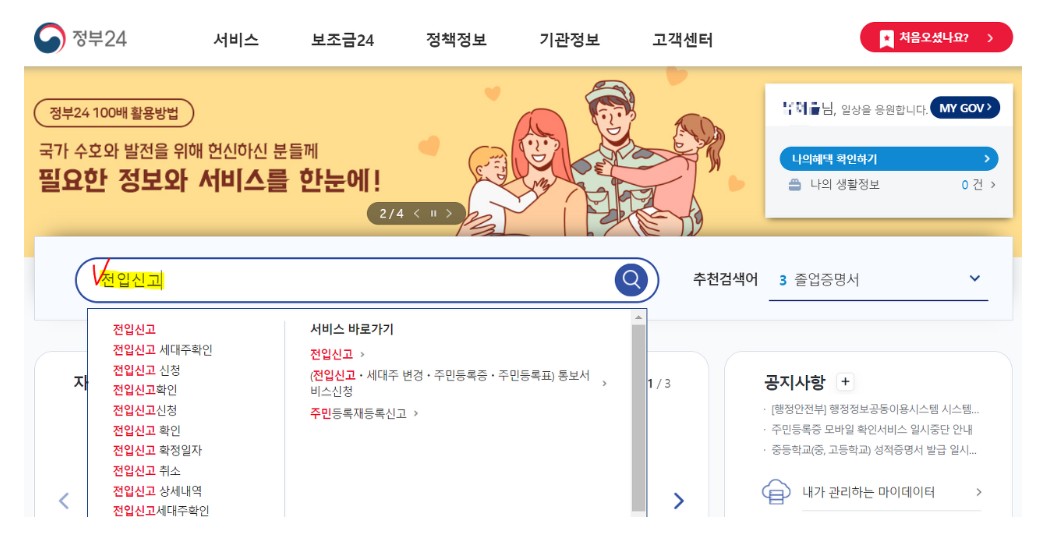 로그인을 했다면 메인화면으로 돌아와 검색창에 [전입신고] 검색을 합니다.