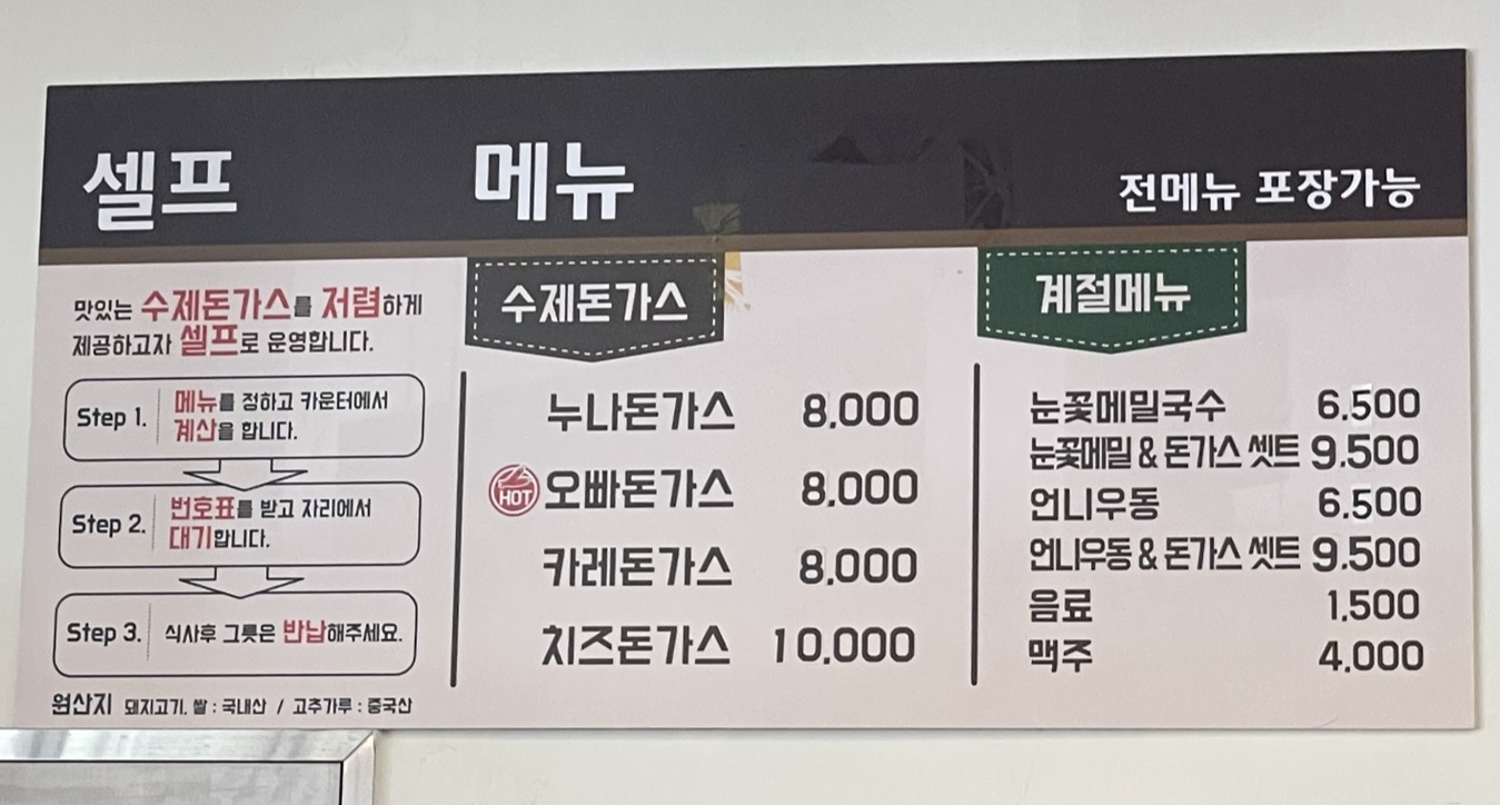 불과 몇 년 전까지만 해도 기본 메뉴인 누나돈가스가 7000원대였는데 지금은 가격이 많이 올랐습니다...