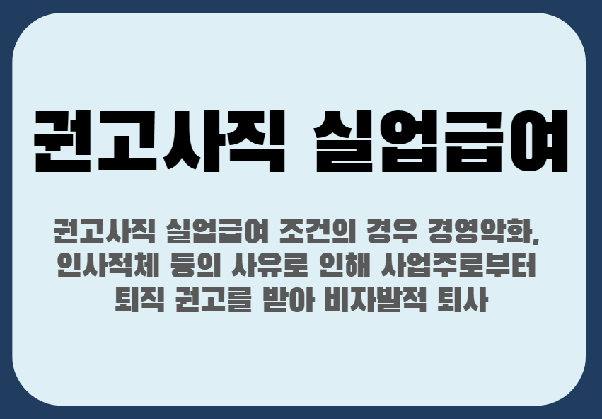 권고사직 실업급여 조건의 경우 경영악화, 인사적체 등의 사유로 인해 사업주로부터 퇴직 권고를 받아 비자발적 퇴사를 해야 합니다.