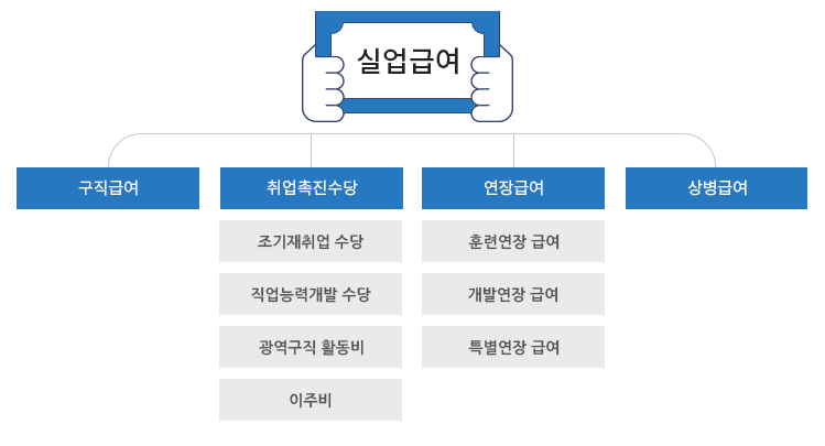 실업급여는 크게 구직급여, 취업촉직수당, 연장급여, 상병급여로 나뉘게 되며 취업촉진수당은 조기재취업수당, 직업능력개발수당, 광역구직 활동비, 이주비로 연장급여는 훈련연장급여, 개발연장급여, 특별연장급여로 세분화됩니다.