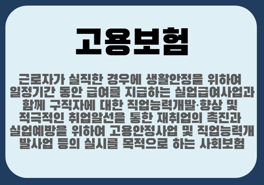 고용보험은 근로를 하던 사람이 실직을 하게 되었을 때 생활안정을 위해 일정 기간 동안 급여를 지급하게 되는 실업급여, 구직활동을 하는 사람에 대한 직업능력개발, 향상 등을 포함합니다.