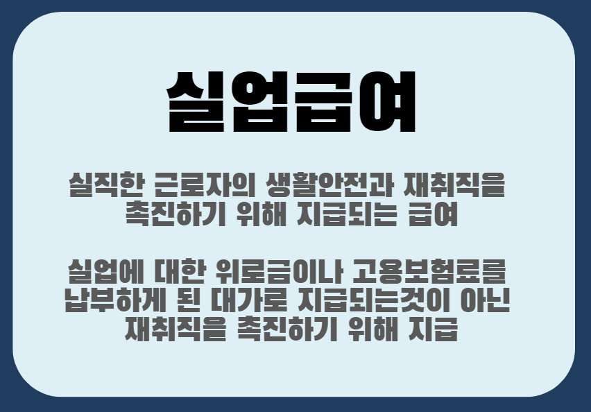 즉, 실업급여는 실업에 대한 위로금이나 고용보험료를 납부하게 된 대가로 지급되는 것이 아닌 재취직을 촉진하기 위해 지급된다는 것입니다.