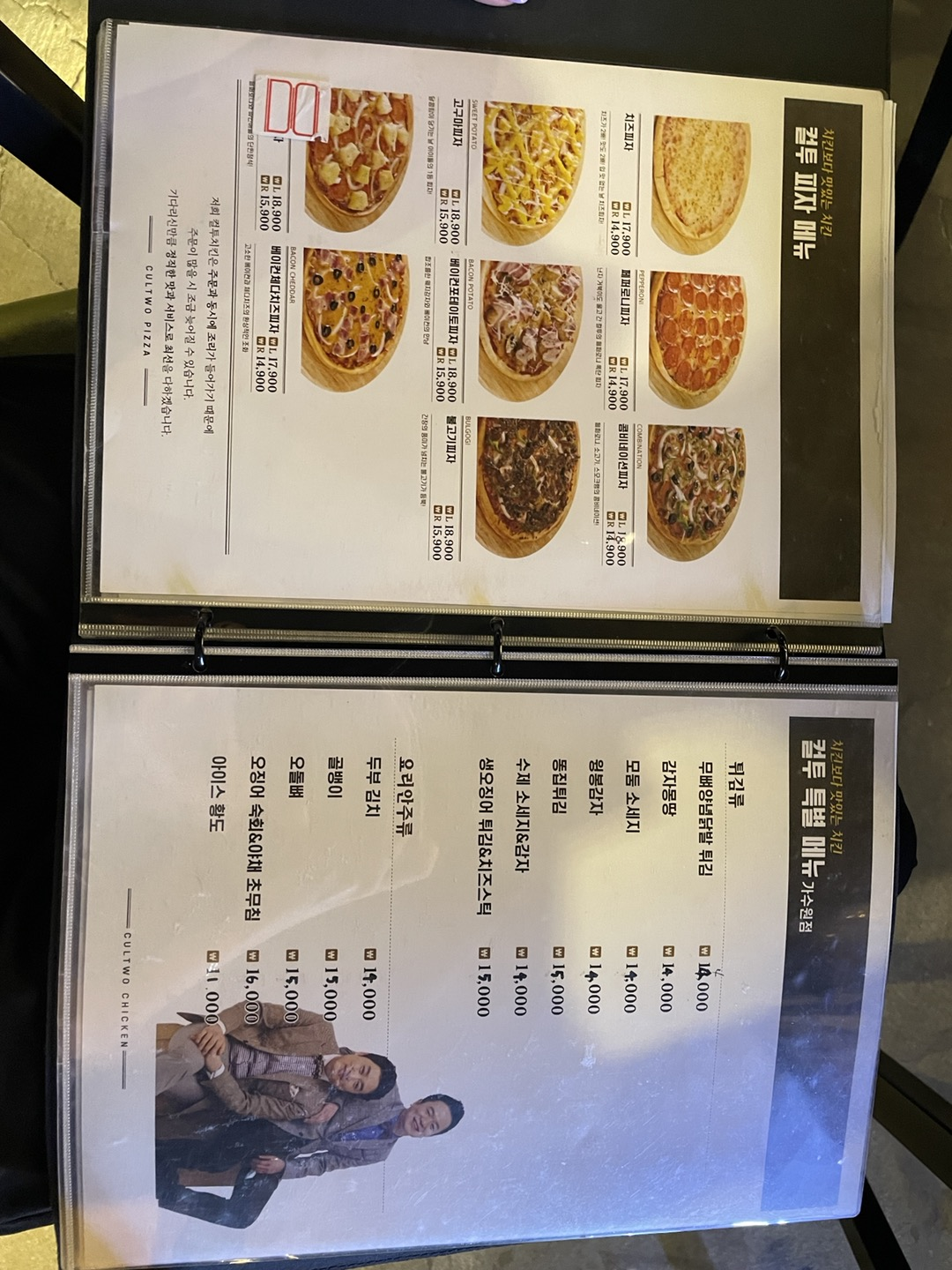 치킨과 피자 두가지 음식이 있지만 저희는 두명이서 가서 피자 한가지만 시켰습니다.