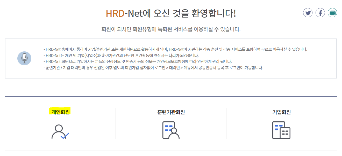 회원가입을 먼저 진행해야하는데 개인회원, 훈련기관회원, 기업회원중 개인회원을 선택합니다.