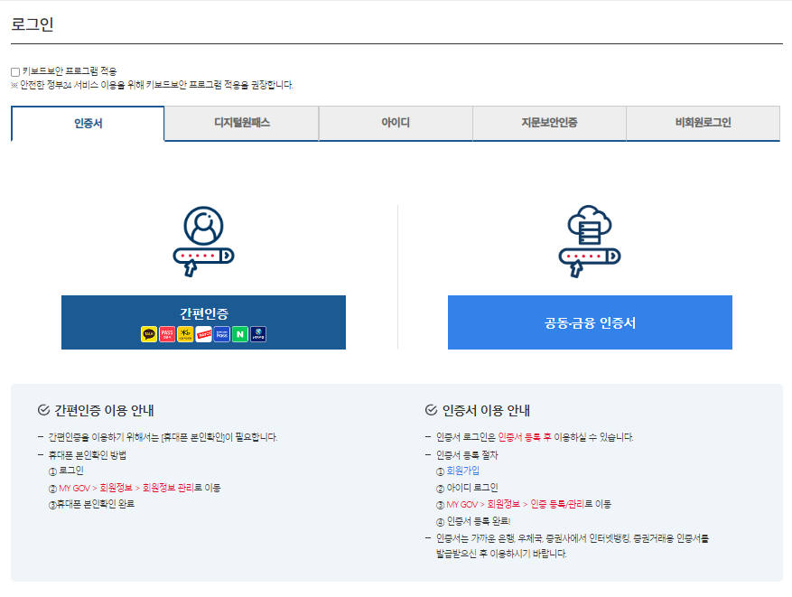 공동인증서나 공인인증서로 로그인할 수 있지만 간편인증서비스도 지원하기 때문에 편하신 방법을 이용하시면 됩니다.