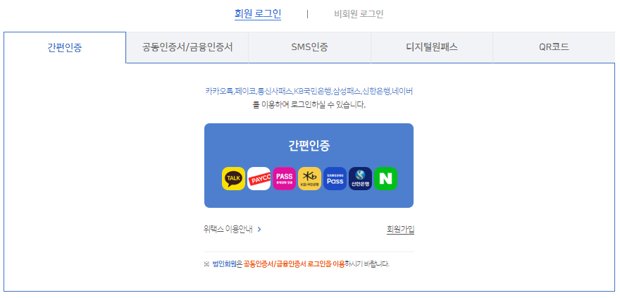 위택스에서는 공동 인증서, 금융인증서는 물론 간편인증도 지원하고 있습니다.